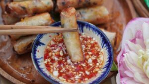 Dip the rice paper in water, shake off excess, and let rest for about 30 seconds. Then place on a flat surface, add fillings (shrimp, meat, etc.) to taste, roll tightly into “cha ram”, deep fry, and serve with sauce.